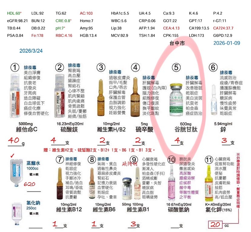 由於認知到對慢性病及癌症患者的重要性,在賀弗診所的維他命C點滴中,自始至終都給予患者大劑量(依體重給予3~5支)甘肽注射針劑,協同大劑量維他命C,以及促進蛋白質生物利用率的共伴效應效應,發揮了3重癌細胞鐵死亡的優越癌症防治表現。
