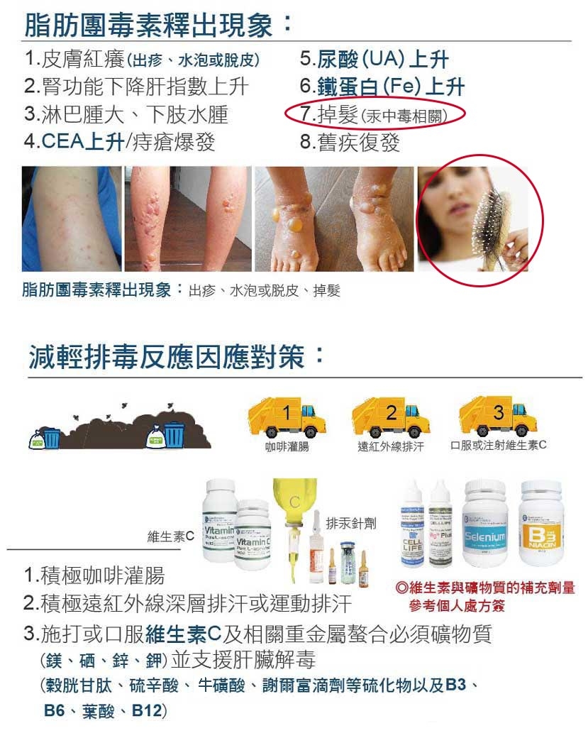 掉髮的問題經常反應中毒的現象,如化療時會掉髮,即是反應了化療藥物的毒性,其他如重金屬(汞、鉛、砷)或種種脂溶性毒素,包括大部分的農藥(為了防止雨水沖刷皆為脂溶性毒素),當這些毒素進入身體時,由於肝腎機能不佳而無法及時將之有效排出體外時,身體會增生脂肪將之儲存在淋巴系統的脂肪團之中,這是人體一種代償性的自我保護措施(打包垃圾,不讓垃圾流竄在血液中造成更多器官損傷),因此,當人們在進行斷食、生酮飲食以及大劑量補充維生素B3時都會促進淋巴系統的脂肪團溶解(lipolysis),因此會將脂肪團內的脂溶性毒素釋放出來,而導致二次中毒(其常見的症狀包含掉髮、極度疲憊、關節疼痛與尿酸升高等問題),這是在執行生酮飲食與斷食的族群常常忽略的地方。他們不了解在執行時可能發生的排毒效應而忽略了補充足夠的優質脂肪及抗氧化劑(解毒劑如:維生素C、B3、E、硒及謝爾富滴劑等)與同時進行咖啡灌腸的重要性,這就是一般外界對生酮飲食教導中所遺漏的重點,只知其一不知其二而導致事倍功半。希望您個人可以留意這個問題的重點與完整執行處方籤的必要性。
