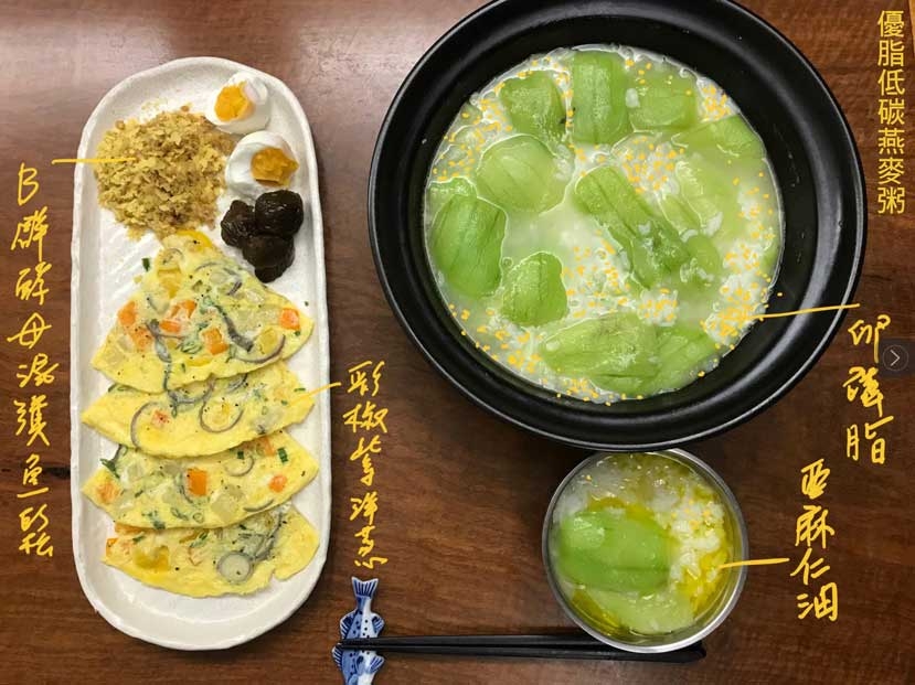 雞蛋5顆、卵磷脂20g、中筋麵粉50g、鹽,拌滿韭菜丁至飽和,煎之,食用前淋上亞麻仁油、黑胡椒