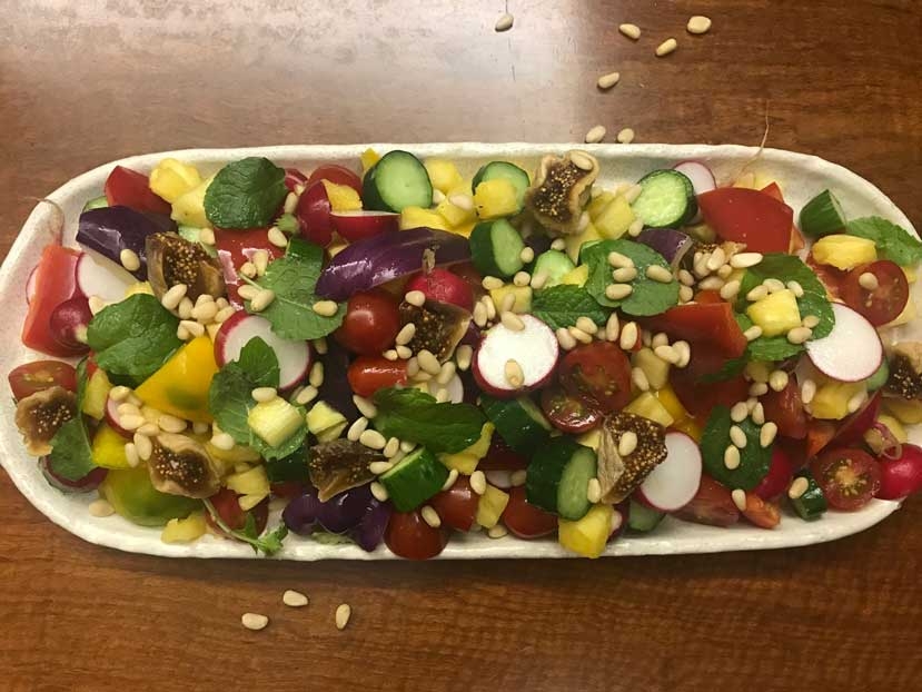 材料:松子、亞麻仁油、有機蔬菜:彩椒(紅紫黃)、櫻桃蘿蔔、小黃瓜、鳳梨、玉女番茄、無花果乾、薄荷葉、檸檬汁