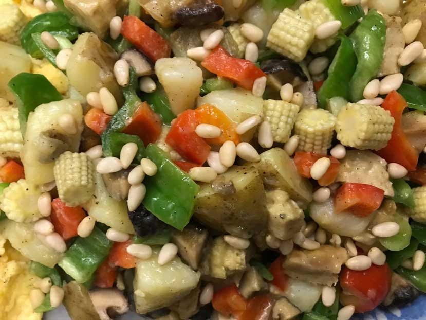 食材:奶油炒蛋(scrambled egg)、黑胡椒、香菇、玉米筍、甜椒(黃、紅)、青椒、亞麻仁油、松子