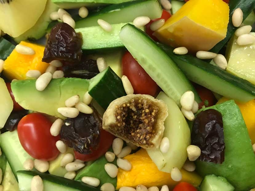 食材:松子、亞麻仁油、阿拉伯棗、無花果(乾)、甜椒(紅、紫)、青椒、木瓜、小黃瓜、薄荷葉、鳳梨、檸檬汁