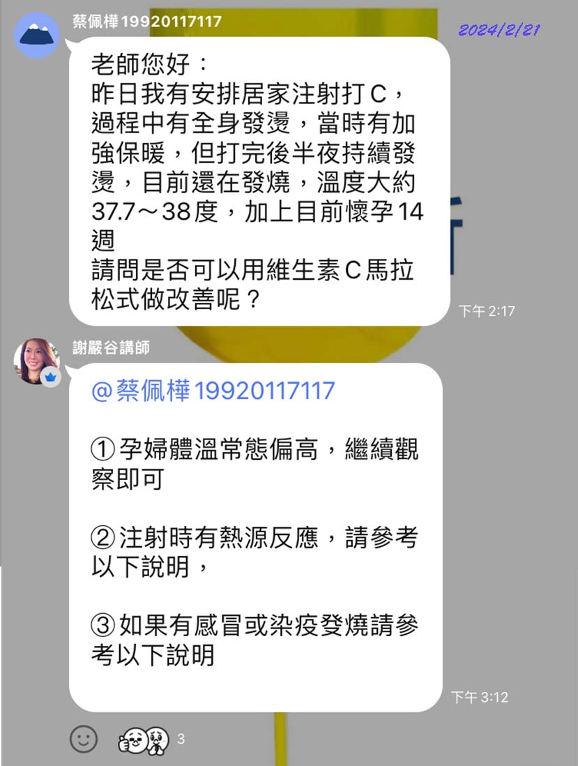 問題2:最近因為常常在量體溫,才發現,每次打完點滴與隔天體溫都會上升,額溫大約都在37.3-5左右,第三天就會恢復正常,這是為什麼呢? 所以都會很想喝冰的酸的果汁這樣可以嗎?