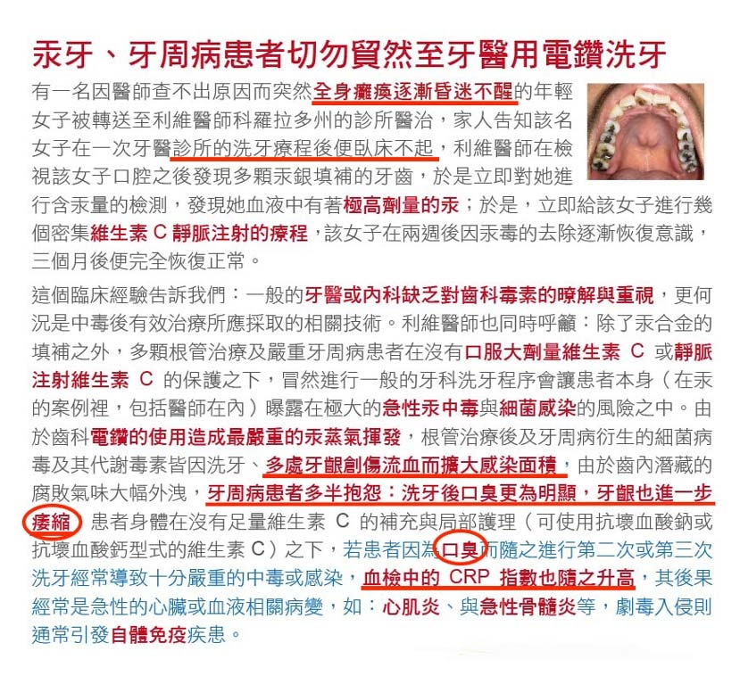 ① 若口中有汞牙或其他重金屬,洗牙二度急性汞中毒,風險非常高