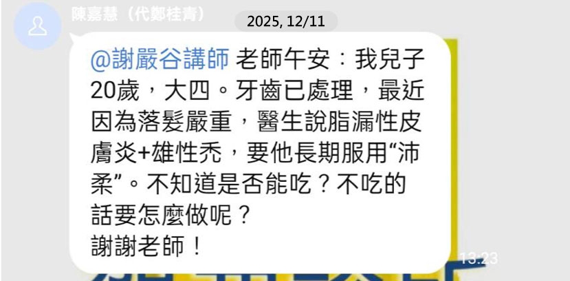 想請教老師,我女兒確診後,頭髮掉的很多。掉髮是確診後遺症,想請問老師該如何處理?