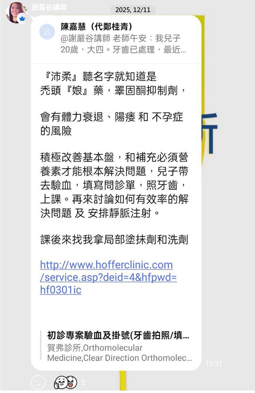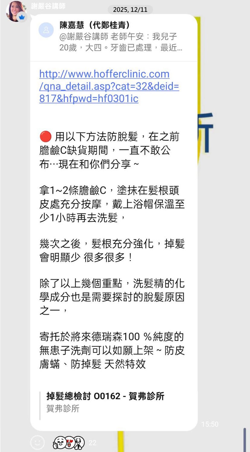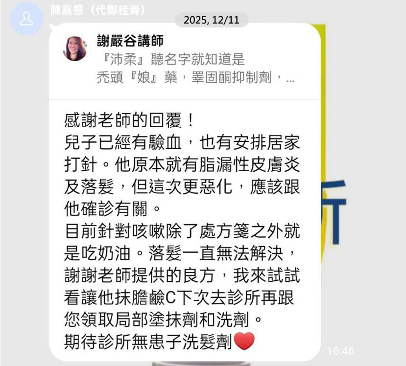 由於這三年來,看過幾次謝老師平日在衛教新冠病毒及疫苗有關刺蛋白的毒性的衛教連結,就像化療藥一樣,刺蛋白對毛囊也會產生毒性,也有很多人因施打疫苗或染疫而毛囊受損,嚴重掉頭髮⋯⋯我看她掉的實在太多,所以帶她去抽血,趕快請謝老師她幫安排施打針劑。