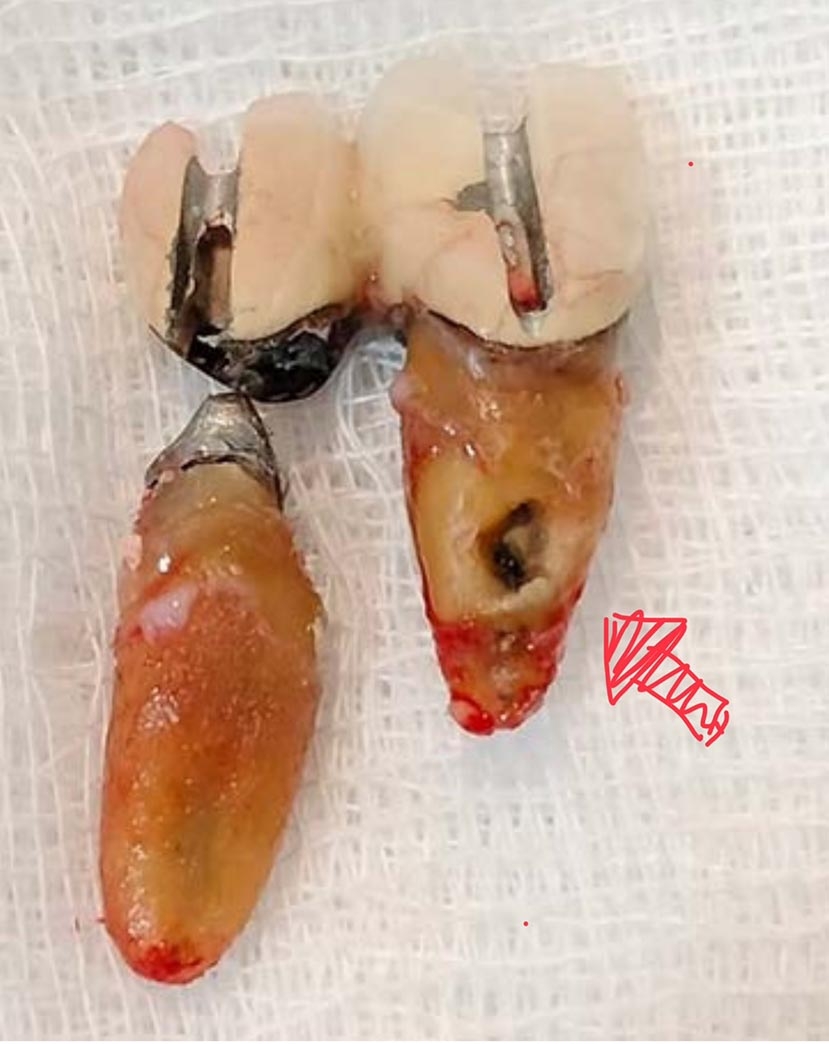以上症狀持續了五年,她服用Ibuprofen止痛消炎藥,無法使疼痛減少,進行了口腔臨床檢查和神經相關檢查,X光顯示,牙科充填材料,的過度充填是產生嚴重神經感染及破壞的主因