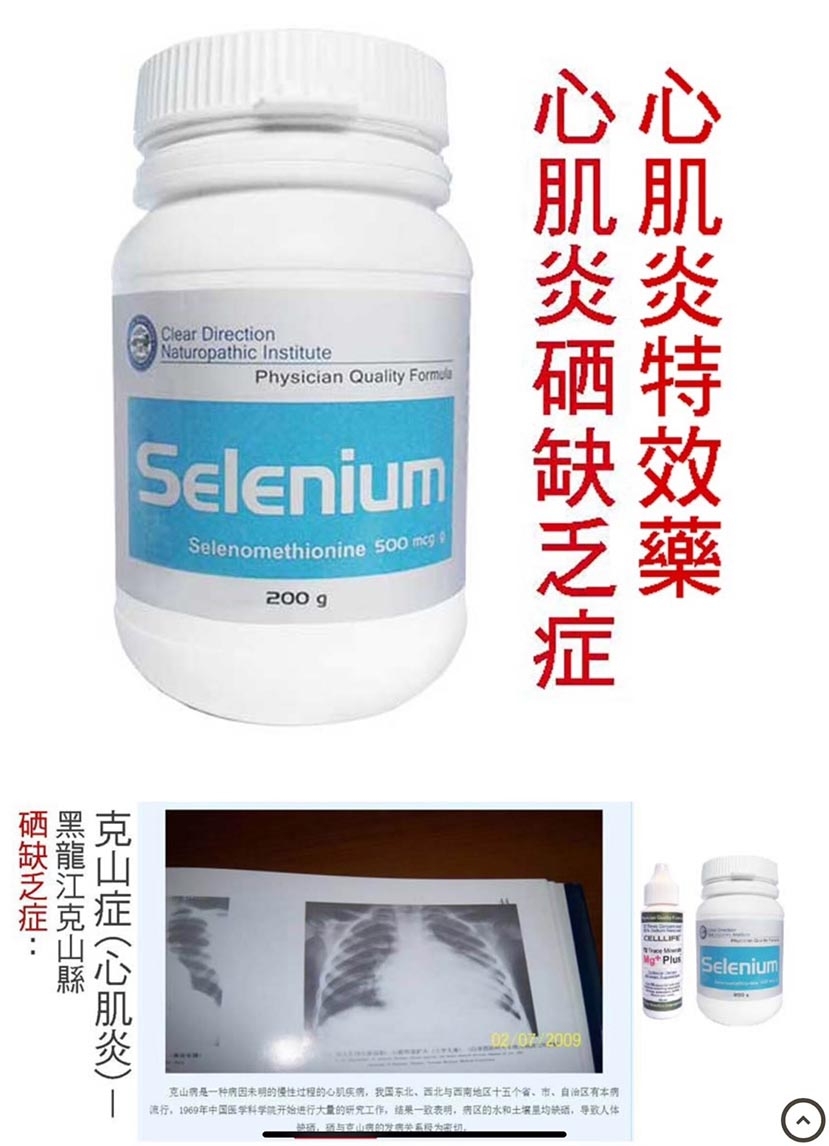 如果因為有積極使用維生素C做防護(注射、C汽水、膽鹼C) ,因而感冒的症狀不明顯,卻有「偶發性的心臟狀況」累、喘、胸悶心悸或甚至下肢水腫⋯最有可能亦是染疫造成的「心肌炎」風險攀升,尤其是家中長輩,以及有心臟衰竭病史 或 疑慮者 ,此時此刻,要更留意補充「硒」!「心肌炎特效藥!」 ,補充劑量不變,補充次數增加一倍。