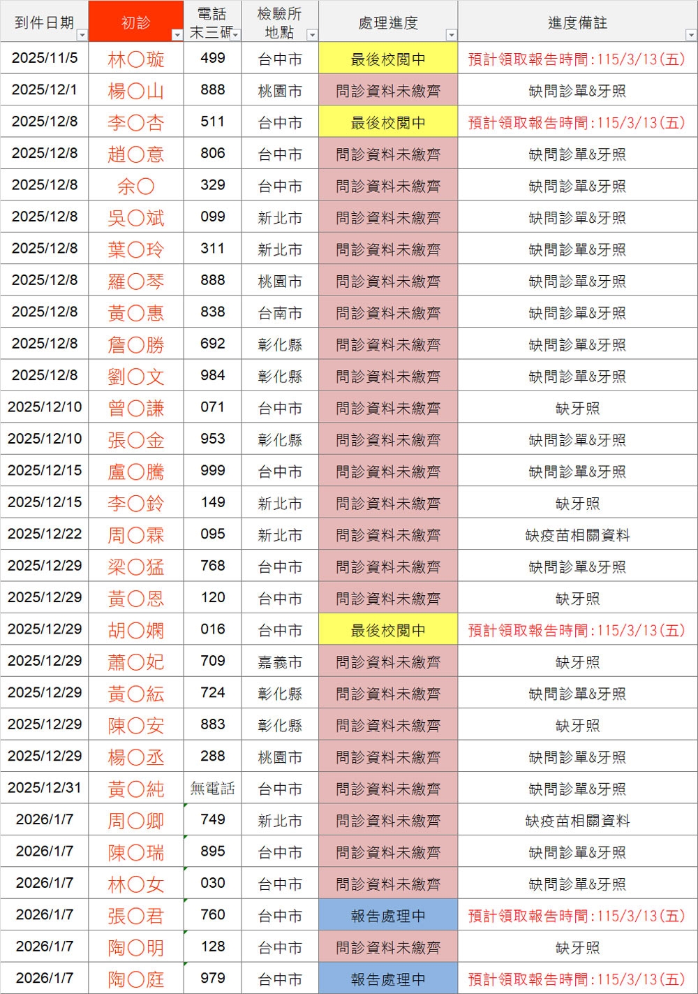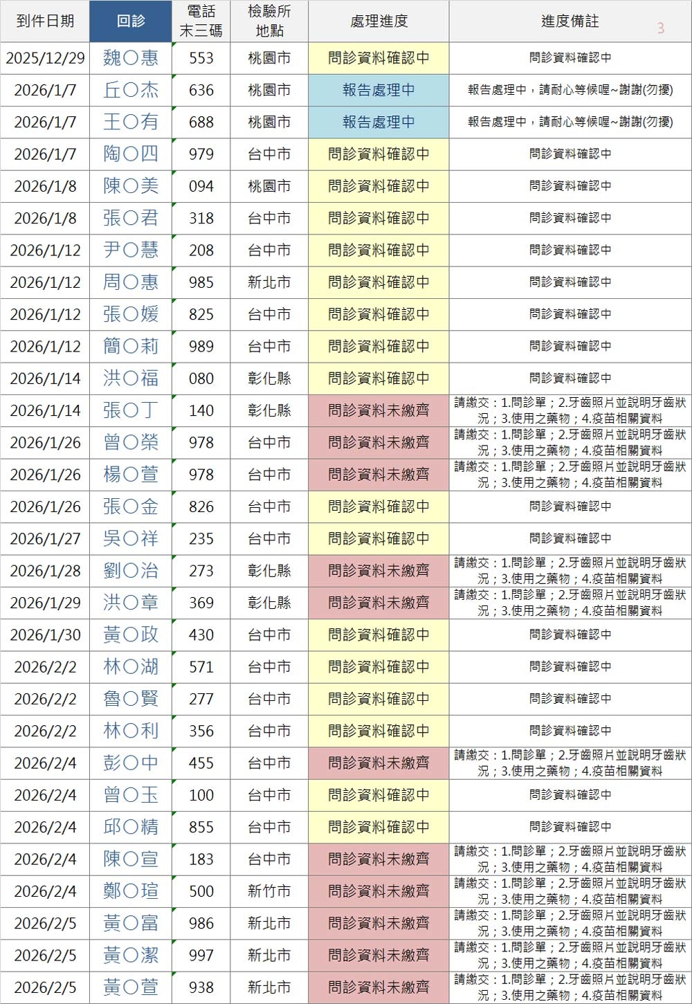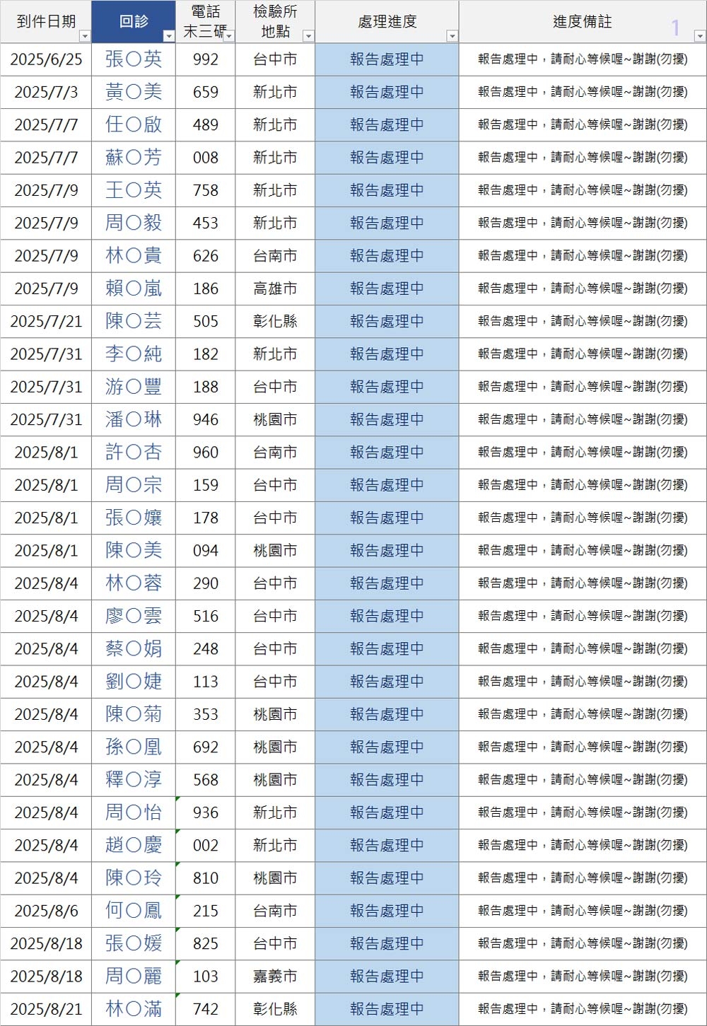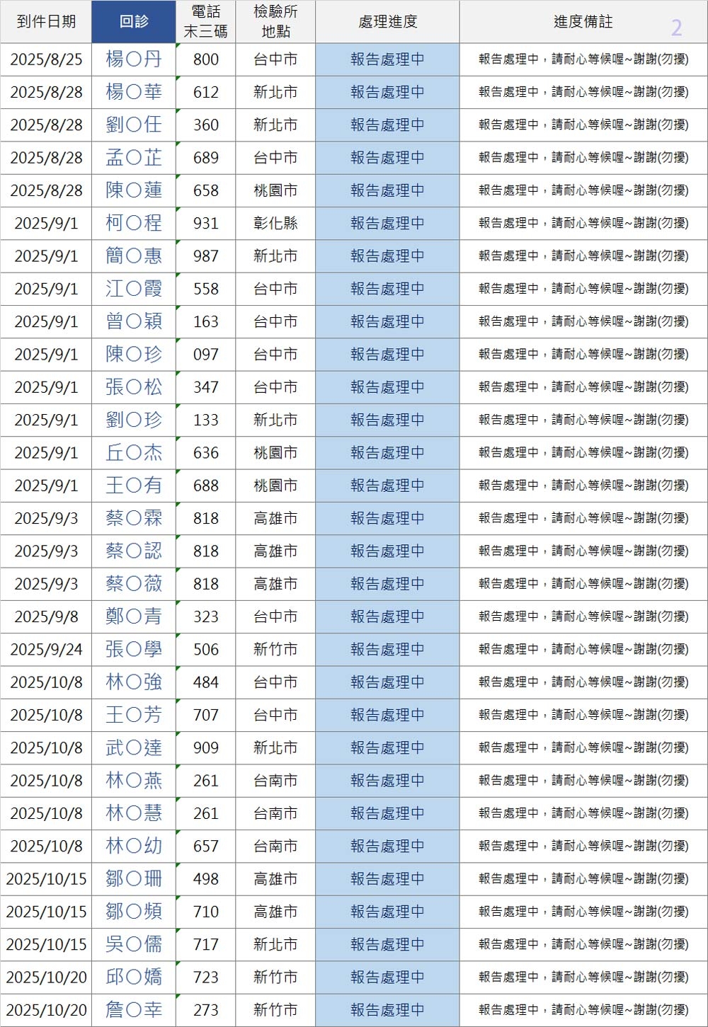 以上連結填寫之前請「先查詢下方表格」,確認您的地區檢驗所報告是否已到件