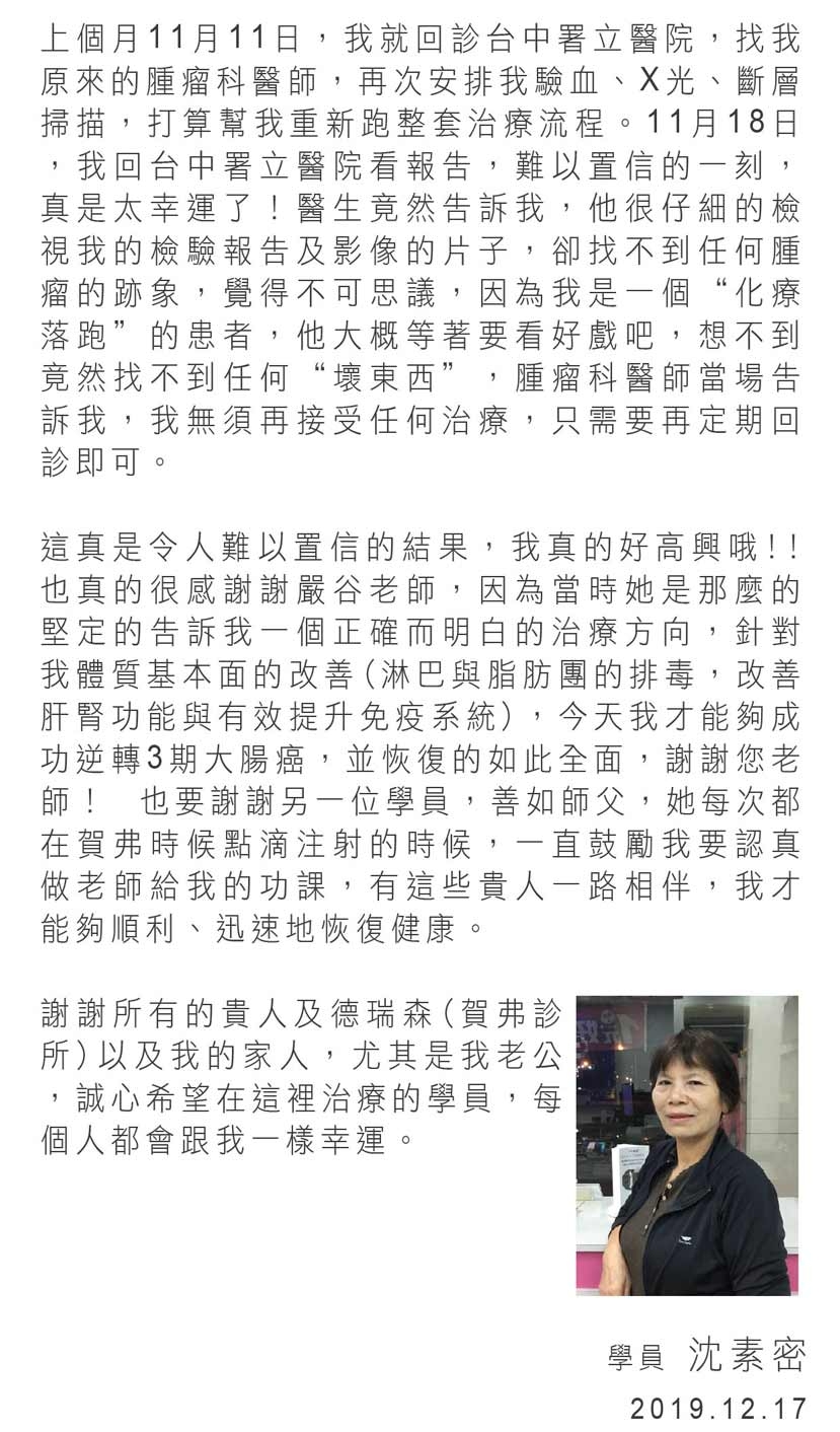沈素密分享三期大腸癌痊癒過程:拒絕化療,勤練基本功,腫瘤消失無蹤